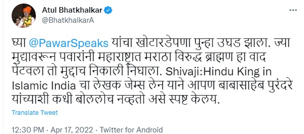 या सर्व प्रकरणानंतर आणि विशेष करुन लेन यांनी मुलाखत समोर आल्यानंतर भाजपाचे आमदार अतुल भातळखकर यांनी या मुलाखतीची लिंक शेअर करत शरद पवारांचा खोटारडेपणा उघड पडल्याचा टोला लगावलाय. “घ्या शरद पवारांचा खोटारडेपणा पुन्हा उघड झाला. ज्या मुद्यावरून पवारांनी महाराष्ट्रात मराठा विरुद्ध ब्राह्मण हा वाद पेटवला तो मुद्दाच निकाली निघाला,” असं भातखळकर म्हणाले. तसेच पुढे बोलताना, “‘शिवाजी : हिंदू किंग इन इस्लामिक इंडिया’चा लेखक जेम्स लेन याने आपण बाबासाहेब पुरंदरे यांच्याशी कधी बोललोच नव्हतो असे स्पष्ट केलय,” असंही भातखळकर यांनी मुलाखतीचा संदर्भ देत सांगितलंय.