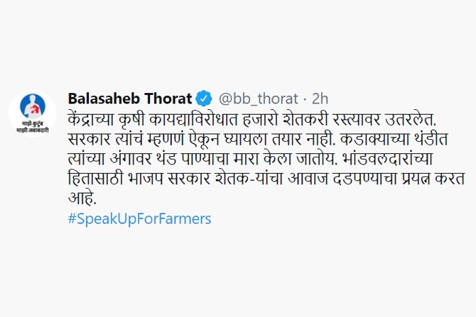 “शेतकरी आपल्या न्याय्य हक्कांसाठी रस्त्यावर उतरले असताना आडमुठी भूमिका न घेता त्यांच्याशी चर्चा करणे, त्यांचे म्हणणे ऐकून घेणे सरकारचे कर्तव्य आहे. पण केंद्र सरकार शेतक-यांचा आवाज दडपण्याचा प्रयत्न करत आहे. शेतक-यांचा आवाज बुलंद करण्यासाठी #SpeakUpForFarmers मोहिमेत सहभागी व्हा!” असं देखील थोरात यांनी ट्विट केलं आहे.