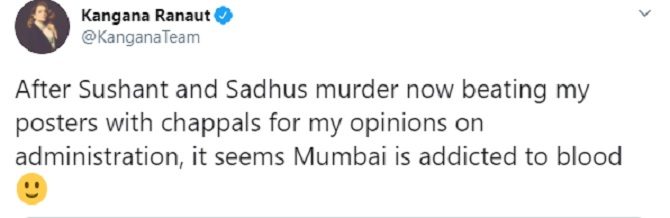 ” सुशांत आणि साधुंच्या खुनानंतर आता प्रशासनानवरच्या माझ्या मतानंतर माझ्या पोस्टरला चप्पल मारण्यात आल्या. मुंबईला आता रक्ताचं व्यसन लागलं आहे असं वाटतंय,” अशी टीका कंगनानं केली. तिनं शिवसेनेच्या महिला आघाडीच्या आंदोलनाचा व्हिडिओ शेअर करत ट्विटरवरून टीका केली.