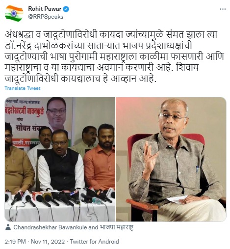 बावनकुळेंच्या या विधानावरुन राजकीय क्षेत्रातून प्रतिक्रिया उमटत असतानाच रोहित पवार यांनी ट्वीटरवरुन बावनकुळेंच्या पत्रकार परिषदेतील फोटो आणि अंधश्रद्धा निर्मुलन समितीचे संस्थापक नरेंद्र दाभोलकरांचा फोटो पोस्ट करत प्रतिक्रिया नोंदवली आहे. “अंधश्रद्धा व जादूटोणाविरोधी कायदा ज्यांच्यामुळे संमत झाला त्या डॉ.नरेंद्र दाभोलकरांच्या साताऱ्यात भाजपा प्रदेशाध्यक्षांची जादूटोण्याची भाषा पुरोगामी महाराष्ट्राला काळीमा फासणारी आणि महाराष्ट्राचा व या कायद्याचा अवमान करणारी आहे. शिवाय जादूटोणाविरोधी कायद्यालाच हे आव्हान आहे,” असं रोहित पवार यांनी म्हटलं आहे.