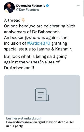 एका ट्विट थ्रेडच्या माध्यमातून फडणवीसांनी शरद पवार यांनी वेगवगेळ्या विषयांवर केलेलं भाष्य आणि त्यावर आपली प्रतिक्रिया नोंदवत या सर्वांची बाबासाहेबांच्या विचाराशी सांगड घातलीय. एका ट्विटमध्ये डॉ. बाबासाहेब आंबेडकर यांचा कलम ३७० ला कडाडून विरोध होता, याचे स्मरण करून घेताना राष्ट्रवादीने याबाबत घेतलेल्या भूमिकेवर केले प्रश्नचिन्ह उपस्थित केले आहे.
