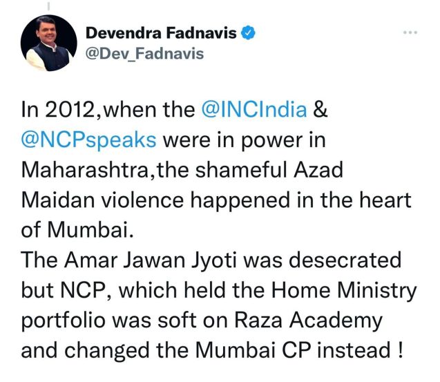 फडणवीस यांनी २०१२ मध्ये राज्यात राष्ट्रवादी आणि काँग्रेसची सत्ता असताना मुंबईतील आझाद मैदानात हिंसाचारानंतर कशी ढिलाई दाखविली गेली यावरुनही बातमीची लिंक पोस्ट करत टीका केलीय. तसेच आघाडी सरकारने त्यावेळी रझा अकादमीवर कारवाई केली नाही, याचाही उल्लेख फडणवीसांनी केलाय.