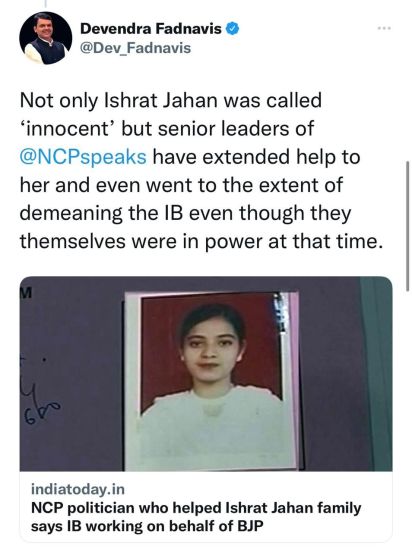 काश्मीर फाईल्स या चित्रपटावरून अलिकडेच शरद पवार यांनी केलेल्या विधानांचाही समाचार फडणवीसांनी घेतला आहे. तसेच नवाब मलिक यांना अटक होताच, ते मुस्लिम आहेत, म्हणून त्यांचा संबंध दाऊदशी जोडला जातोय, या विधानाचेही फडणवीसांनी स्मरण करुन देत पवारांवर निशाणा साधला. तसेच अन्य एका ट्विटमध्ये इशरत जहाँ ही निर्दोष होती असं पवारांनी वक्तव्य केल्याच्या बातमीची लिंक पोस्ट कर पवारांवर टीका केलीय. इतक्यावरच न थांबता राष्ट्रवादीच्या वरिष्ठ नेत्यांनी इशरतच्या मदतीसाठी केलेल्या प्रयत्नांचाही उल्लेख फडणवीसांनी केलाय.