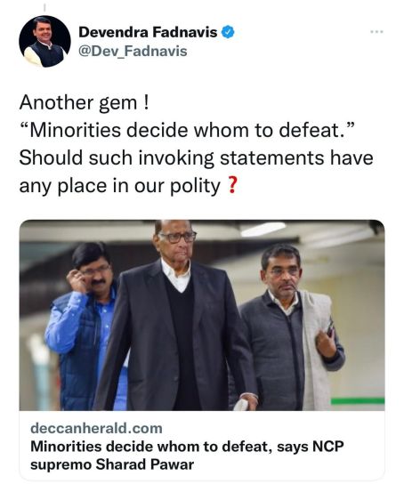 तसेच पुढे बोलताना फडणवीसांनी संविधानात धर्माच्या आधारावर आरक्षणाला विरोध असताना मुस्लिम आरक्षणासाठी सातत्याने पुढाकार का घेतला, याबद्दलच्याही लिंक पोस्ट केल्यात. अल्पसंख्यक समाज कोणाचाही पराभव करू शकतो या शरद पवारांच्या वक्तव्याची आठवणही फडणवीसांनी करुन दिली. तसेच ‘हिंदू टेरर’ हा शब्दप्रयोग सर्वप्रथम कुणी केला, असे विचारत फडणवीसांनी निशाणा साधलाय. सच्चर समितीचा अहवाल लागू करण्यासाठी केलेल्या मागणीचाही उल्लेख फडणवीसांनी या १४ ट्विटपैकी एकामध्ये केलाय.