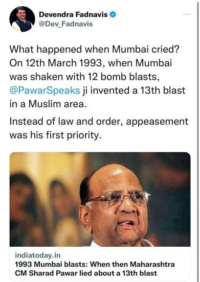 तसेच १९९३ मध्ये मुंबईत झालेल्या बॉम्बस्फोटांनंतर १३ वा बॉम्बस्फोट हा मुस्लिम वस्तीत झाल्याचे खोटे सांगितल्यासंदर्भातही फडणवीसांनी प्रश्न उपस्थित केला आहे. “कश्मीर फाईल्समध्ये काश्मिरी पंडितांच्या वेदनांचे चित्रण असताना असा दुटप्पीपणा का? तुमच्या छद्मी धर्मनिरपेक्षतेच्या अजेंड्याला धक्का बसेल म्हणून?,” असा प्रश्न फडणवीसांनी शरद पवारांना विचारलाय. तसेच, “काश्मीर फाईल्स हा चित्रपट कोणत्याही धर्माच्या विरोधात नाही. मग केवळ अनुनयाच्या हेतूने जातीय विद्वेष पसरविण्याचा प्रयत्न का?,” असंही फडणवीस म्हणालेत.