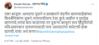 “एका बाजूला आपल्या पुत्राने व प्रवक्त्याने वंदनीय बाळासाहेबांच्या शिवसैनिकांना डुकरं, नाल्याची घाण, रेडा, कुत्रे, जाहील व मृतदेह म्हणायचे, त्यांचा बाप काढायचा तर दुसऱ्या बाजूला मात्र हिंदूविरोधी महाविकास आघाडी सरकार वाचवण्यासाठी याच आमदारांना समेटाची हाक द्यायची, याचा अर्थ काय?,” असा प्रश्न शिंदे यांनी ट्विटरवरुन मुख्यमंत्र्यांच्या आवाहनावर विचारलाय. या ट्विटमध्ये शिंदे यांनी महाराष्ट्राची दिशाभूल करु नका अशा अर्थाचा हॅशटॅगही वापरला आहे.