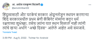 “हिंदुत्वासाठी औट घटकेचं ओढूनतोडून स्थापन झालेल्या शिंदे सरकारमधील प्रथम श्रेणी कॅबिनेट मंत्र्यांना कट्टर धर्म रक्षणाच्या शुभेच्छा,” असं मिटकरींनी म्हटलंय. त्याचप्रमाणे याच ट्विटमध्ये त्यांनी, “ज्यांना यात स्थान मिळालं नाही त्यांनी त्यांचे खऱ्या अर्थाने ‘अच्छे दिवस’ आलेले आहेत असे समजावे,” असा खोचक टोला लगावला आहे.