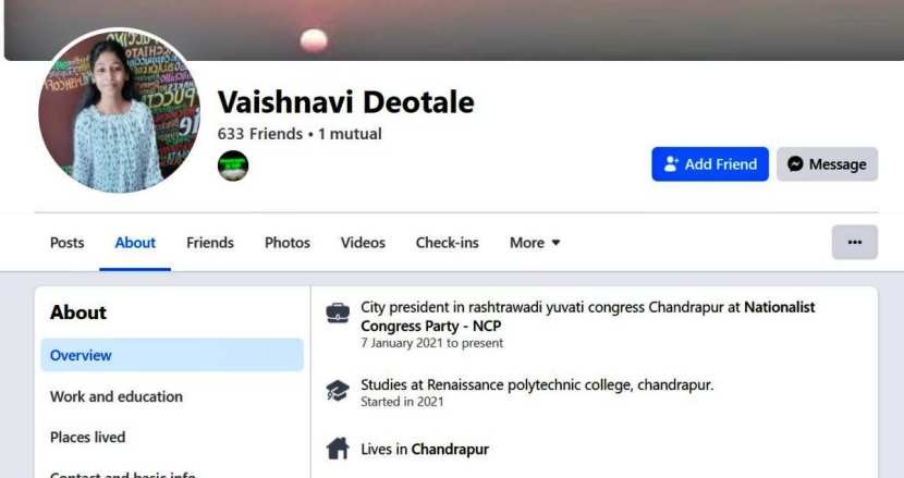 दरम्यान, हे प्रकरण समोर आल्यानंतर चंद्रपूर राष्ट्रवादी काँग्रेसचे जिल्हाध्यक्ष राजीव कक्कड यांनी आरोपी तरुणीचं महिनाभरापूर्वीच निलंबन केल्याचा दावा केलाय. मात्र, या तरुणीच्या फेसबुकवर अजूनही ती राष्ट्रवादी काँग्रेसच्या पदावर असल्याचा उल्लेख आहे.
