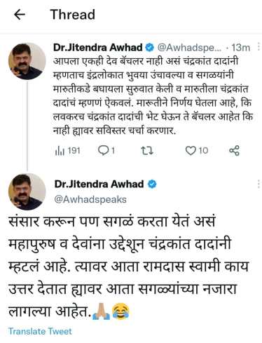 आपला एकही देव बॅचलर नाही असं चंद्रकांतदादांनी म्हणताच इंद्रलोकात भुवया उंचावल्या आणि सगळ्यांनी मारुतीकडे पाहण्यास सुरूवात केली आणि मारुतीला चंद्रकांत पाटील यांचं म्हणं ऐकवलं. मारुतीने निर्णय घेतला आहे की लवकरच चंद्रकांतदादांची भेट घेऊन ते बॅचलर आहेत की नाही यावर सविस्तर चर्चा करणार. संसार करून पण सगळं करता येतं असं महापुरुष आणि देवांना उद्देशून चंद्रकांत दादांनी म्हटलं आहे. त्यावर आता रामदास स्वामी काय उत्तर देणार याकडे सगळ्यांच्या नजरा लागल्या आहेत. असं खोचक ट्विट जितेंद्र आव्हाड यांनी केलं आहे.