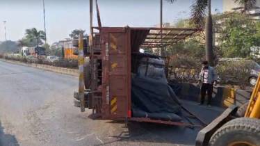 नवी मुंबई : ठाणे बेलापूर मार्गावर कोपरखैरणे स्टेशन नजीक रिलायन्स कंपनी समोरील मार्गावर ट्रक चालकाचे नियंत्रण सुटल्याने ट्रक आडवा झाला. ऐन गर्दीच्या वेळी अपघात झाल्याने पनवेल देशाला जाणारी वाहतूक काही वेळ ठप्प झाली होती. मात्र वाहतूक पोलिसांनी प्रयत्नांची शर्त करून वाहतूक कोंडीतून मार्ग काढत ट्रक बाजूला काढला.