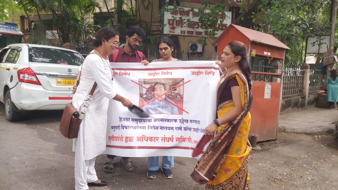 पुणे: ठाकरे गटाचे प्रमुख माजी मुख्यमंत्री उद्धव ठाकरे यांच्यावर टीका करतेवेळी भाजपचे नेते आमदार नितेश राणे यांनी 'हिजडा' या शब्दाचा वापर केला. या विधानाच्या निषेधार्थ पुण्यात तृतीयपंथी हक्क अधिकार संघर्ष समितीच्या वतीने नितेश राणे यांच्या फोटोला जोडे मारून निषेध नोंदविण्यात आला. या आंदोलनात राज्य समन्वयक शामिभा पाटील, निकिता मुखदल या सहभागी होऊन नितेश राणे यांच्या विरोधात जोरदार घोषणाबाजी देखील केली.