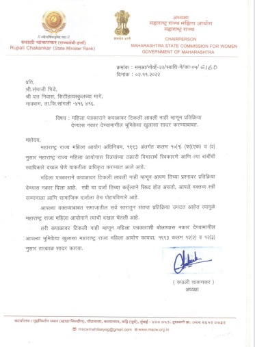 या प्रकरणावरुन प्रतिक्रिया उमटत असतानाच महाराष्ट्र राज्य महिला आयोगाच्या अध्यक्षा रुपाली चाकणकर यांनी भिडे यांना टिकली लावल्यावरच प्रतिक्रिया देणार ही भूमिका तातडीने स्पष्ट करावी अशी नोटीस पाठवली आहे. चाकणकर यांच्या लेटरहेडवर भिडेंना ही नोटीस पाठवण्यात आली आहे. संभाजी भिडे यांच्या सांगलीमधील पत्त्यावर ही नोटीस पाठवण्यात आली असून या नोटीसचा विषय ‘महिला पत्रकाराने कपाळावर टिकली लावली नाही म्हणून प्रतिक्रिया देण्यास नकार देण्यामागील भूमिकेचा खुलासा सादर करण्याबाबत’ असा असल्याचा उल्लेखही करण्यात आला आहे.
