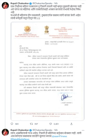 “साम टीव्हीच्या महिला पत्रकाराला तू टिकली लावली नाही म्हणून तुझ्याशी बोलणार नाही असे सांगत त्या महिलेचा आणि पत्रकारितेचाही अपमान करणाऱ्या संभाजी भिडेंचा निषेध आहे. याआधी ही महिलांना हीन समजणारी, तुच्छतादर्शक वक्तव्य त्यांनी वारंवार केली आहेत त्यांची मनोवृत्ती यातून दिसून येते, त्यांना आत्मचिंतनाची गरज आहेच. टिकली ही महिलेच्या कर्तृत्वाचं मोजमाप नाही. त्यांनी केलेल्या वक्तव्याचा तातडीने खुलासा करावा,” अशा कॅप्शनसहीत रुपाली चाकणकर यांनी हे पत्र ट्वीटरवर शेअर केलं आहे.