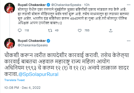 मात्र या लग्नाची अकलूजपासून सोशल मीडियावरही चर्चा असतानाच आता रुपाली चाकणकर यांनी या लग्नाच्या चौकशीचे आदेश दिले आहेत. “सोलापूर येथील एका तरुणाने मुंबईतील जुळ्या बहिणींशी एकाच मांडवात लग्न केले आहे. या लग्नाची सोशल मीडियातून सर्वत्र चर्चा सुरू आहे. तसेच माध्यमातून या लग्नाच्या बातम्या सुरु आहेत. भारतीय दंड संहितेच्या कलम ४९४ प्रमाणे हा गुन्हा आहे. तरी सोलापुर पोलिस अधिक्षकांना आपण उपरोक्त बाबत चौकशी करून त्वरीत कायदेशीर कारवाई करावी. तसेच केलेल्या कारवाई बाबतचा अहवाल महाराष्ट्र राज्य महिला आयोग अधिनियम १९९३ चे कलम १२ (१) व १२ (२) अन्वये तात्काळ सादर करावा,” असे निर्देश चाकणकर यांनी दिले आहेत. यासंदर्भात त्यांनी दोन ट्वीट केले आहेत.