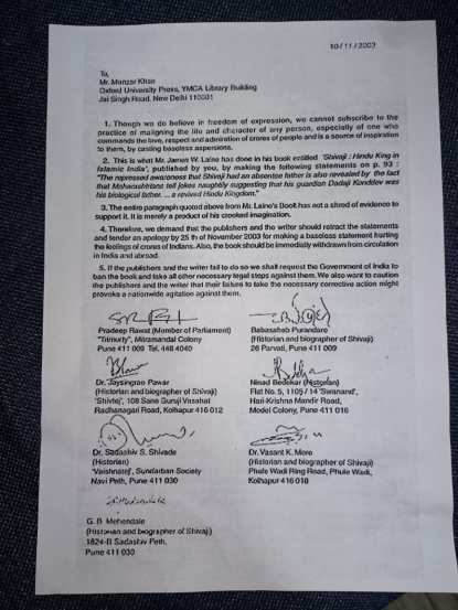 एका शिवप्रेमीने आपल्याला हे पत्र पाठवल्याचं देशपांडे म्हणाले. या पत्रात नमूद करण्यात आलेला मजकूर देखील त्यांनी वाचून दाखवला. “ज्यांच्यावर कोट्यवधी भारतीयांचं प्रेम आहे, त्यांच्याबद्दलचे निराधार आरोप आम्ही सहन करणार नाही. जेम्स लेन यांनी त्यांच्या पुस्तकात हेच केलं आहे. हे पुस्तक तुमच्याकडून प्रकाशित होत आहे. शिवाजी महाराज आणि दादोजी कोंडदेवांविषयी जेम्स लेननं जे विधान केलंय, ती त्याच्या घाणेरड्या मनोवृत्तीची उत्पत्ती आहे. त्यामुळे प्रकाशक आणि लेखकांनी २५ नोव्हेंबर २००३ पर्यंत कोट्यवधी भारतीयांच्या भावना दुखावल्याबद्दल माफी मागावी आणि हे पुस्तक भारत आणि परदेशातूनही मागे घ्यावं. जर प्रकाशक आणि लेखकानं असं काही केलं नाही, तर भारत सरकारने या पुस्तकावर बंदी घालावी आणि त्यांच्याविरोधात योग्य ती कारवाई करावी, अशी विनंती आम्ही करू”, असं या पत्रातून बाबासाहेब पुरंदरे आणि इतर इतिहासकारांनी ऑक्स्फर्ड युनिव्हर्सिटी प्रेसला सांगितल्याचं संदीप देशपांडे म्हणाले.