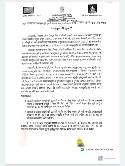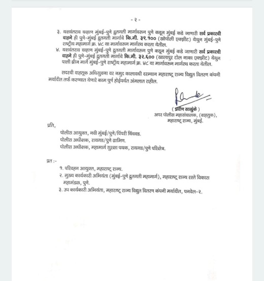 महाराष्ट्र राज्य वीज वितरण कंपनीतर्फे कोन ब्रिज 22 केव्ही क्षमतेच्या भातान आजीवली वाहिनीचे काम केले जाणार आहे. दुपारी 2 ते दुपारी 3 या कालावधीत हे काम केले जाणार आहे. त्यामुळे या एक तासाच्या कालावधीत मुंबई आणि पुणे दोन्ही मार्गिकेवरील वाहतूक बंद ठेवली जाणार आहे. वाहतूक विभागाचे अप्पर पोलिस महासंचालक प्रवीण साळुंखे यांनी याबाबतची वाहतूक अधिसूचना जारी केली आहे.