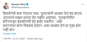 नारायण राणे यांनी ट्विटरवरुन गुवहाटीमधील हॉटेलमध्ये राहत असणाऱ्या शिवसेनेच्या बंडखोर आमदारांबद्दल राऊत यांनी केलेल्या वक्तव्यावरुन शिवसेनेला लक्ष्य केलं आहे. तसेच या ट्विटमध्ये त्यांनी युवराज असा उल्लेख करत आदित्य ठाकरेंनाही टोला लगावला आहे. “शिवसेनेची सत्ता गेल्यात जमा. युवराजांनी धमक्या देणं बंद करावं. अंगावरचे मच्छर मारता येत नाहीत अशांच्या, ‘गुवाहाटीतील हॉटेलमधून बंडखोरांची प्रेतं बाहेर पडतील’, अशा वल्गनांवर कोण विश्वास ठेवेल?,” असा टोला राणेंनी लगावला आहे.