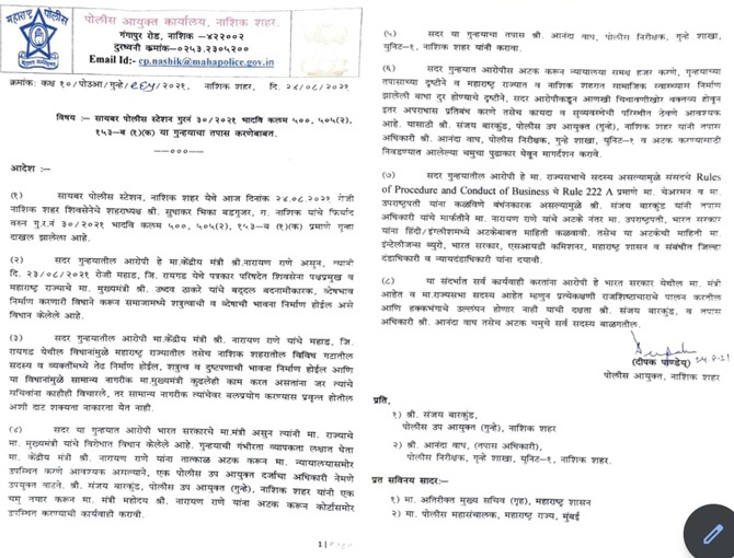 मुख्यमंत्र्यांबद्दल वादग्रस्त वक्तव्याप्रकरणी अडचणीत आलेल्या नारायण राणे यांच्या अटकेची कायदेशीर प्रक्रिया सुरू झालेली आहे, अशी माहिती नाशिकचे पोलीस आयुक्त दीपक पांडेय यांनी दिली आहे. नारायण राणे यांच्यावर गुन्हा दाखल झालेला असून गुन्ह्याचं गांभीर्य पाहून याची पुनरावृत्ती होऊ नये म्हणून राणेंना अटक करण्यासाठी पथक पाठवण्यात आलं आहे. राणेंच्या अटकेदरम्यान त्यांच्या केंद्रीय मंत्रीपदाचा आदर राखून तसंच हक्कभंग होणार नाही याची दक्षता घेऊन कारवाई करण्यात येईल असंही त्यांनी सांगितलं आहे.