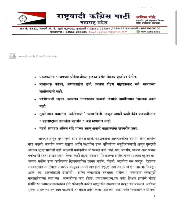 राष्ट्रवादीचे नेते आणि माजी आमदार अनिल गोटे यांनी देवेंद्र फडणवीस यांच्यावर टीका केली. संतापामध्ये मी कधीही फडणवीस महाराष्ट्राच्या राजकारणाला लागलेला महारोग असं म्हणणार नाही. वस्तुस्थिती असली तरी तसे मी कधी बोलणार नाही असं वादग्रस्त वक्तव्य त्यांनी केलं आहे. अनिल गोटे यांनी एक पत्रक जारी केलं असून पडळकरांनी केलेल्या वक्तव्यावर भाष्य करताना देवेंद्र फडणवीस यांच्यावरही टीका केली आहे.