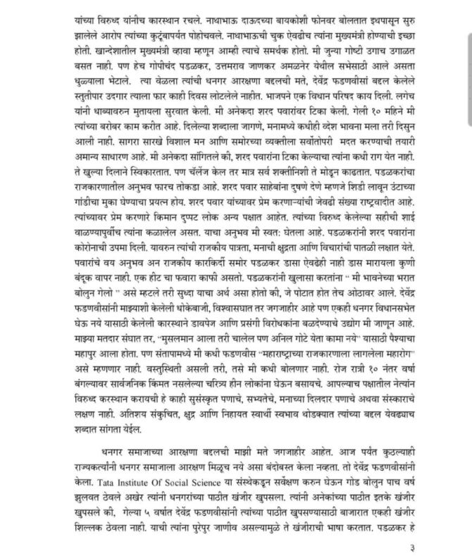 “देवेंद्र फडणवीसांनी माझ्याशी केलेली धोकेबाजी, विश्वासघात जगजाहीर आहे. एकही धनगर विधानसभेत घेऊ नये यासाठी केलेली कारस्थानं, डावपेच आणि प्रसंगी विरोधकांना बळ देण्याचे उद्योग मी जाणून आहे. माझ्या मतदारसंघात तर मुसलमान आला तरी चालेल पण अनिल गोटे येता कामा नये यासाठी पैशाचा महापूर आला होता. पण संतापामध्ये मी कधीही फडणवीस महाराष्ट्राच्या राजकारणाला लागलेला महारोग असं म्हणणार नाही. वस्तुस्थिती असली तरी तसे मी कधी बोलणार नाही”.