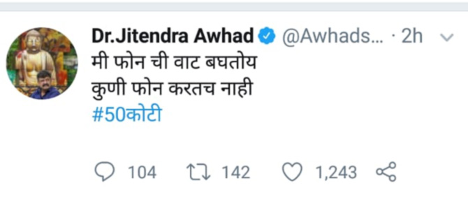 राज्यातील विधानसभेचे निकाल लागल्यानंतर दोन आठवड्यांनंतरही सत्ता स्थापनेचा तिढा सुटलेला नाही. त्यातच आज (८ नोव्हेंबर) रोजी विधानसभेचा कार्यकाळ संपत असल्याने राज्यात राष्ट्रपती लागवत लागू होण्याची शक्यताही व्यक्त केली जात आहे. त्यामुळेच राज्यामध्ये फोडाफोडीचे राजकारण होण्याच्या भितीने सर्वच प्रमुख पक्षांनी आपल्या आमदारांना एकत्र ठेवण्यासाठी त्यांना वेगवेगळ्या ठिकाणी हवल्याचे वृत्त समोर येत आहे. याच पार्श्वभूमीवर वडेट्टीवार यांनी भाजपाकडून शिवसेना तसेच काँग्रेस आमदाराला ५० कोटींची ऑफर दिल्याचा आरोप केला आहे. मात्र हिरामण खोसकर या काँग्रेस आमदाराने मला कोणतीही ऑफर आली नाही असं म्हणत विजय वडेट्टीवार यांचा दावा फेटाळला आहे. याच मुद्द्यावरुन आव्हाडांनी ट्विटवरुन टोला लगावला आहे. “मी फोनची वाट बघतोय कुणी फोन करतच नाही,” असं ट्विट आव्हाड यांनी केलं आहे. या ट्विटमध्ये त्यांनी ५० कोटी हा हॅशटॅगही वापरला आहे.