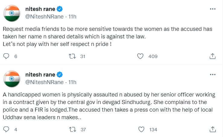 नितेश राणेंनी ट्विटरवरुन चार ट्विटच्या माध्यमातून या प्रकरणावर भाष्य केलं आहे. “सिंधुदुर्गमधील देवगड येथे केंद्र सरकारसाठी कंत्राटी पद्धतीने काम करणाऱ्या एका अधिकाऱ्याने त्यांच्या कार्यालयातील एका दिव्यांग महिलेला मारहाण करुन तिला शिवीगाळही केला. या महिलेने या प्रकरणामध्ये गुन्हा दाखल केला. त्यानंतर या आरोपीने उद्धव ठाकरेंच्या सेनेतील स्थानिक नेत्याच्या मदतीने पत्रकार परिषद घेतली. प्रसारमाध्यमांना विनंती करु इच्छितो की त्यांनी पीडितेबद्दल संवेदनशीलता दाखवावी. त्याने पत्रकार परिषदेत त्या महिलेचं नावं घेतलं आणि तिची माहिती दिली. हे खरं तर कायद्याच्या विरुद्ध असून आपण कोणीही त्या महिलेच्या आत्मसन्मानाशी खेळता कामा नये,” असं नितेश राणे म्हणाले.