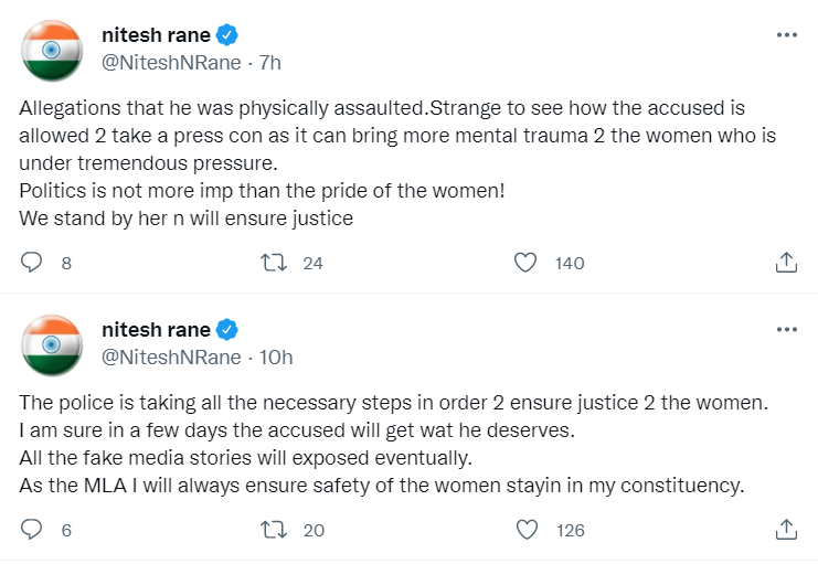 “या महिलेला न्याय मिळवून देण्यासाठी पोलीस शक्य ते सर्व प्रयत्न करत आहेत. मला विश्वास आहे की काही दिवसांमध्ये आरोपीला योग्य शिक्षा मिळेल. प्रसारमाध्यमांमधील सर्व खोट्या बातम्यांमागील सत्य समोर येईल. येथील स्थानिक आमदार म्हणून या मतदारसंघातील सर्व महिलांच्या सुरक्षेची मी काळजी घेईन. या आरोपीने त्याला मारहाण केल्याचा आरोप केला. मात्र आरोपीला पत्रकार परिषद घेत असल्याचं पाहून आश्चर्य वाटलं. यामुळे त्या महिलेवर दबाव टाकून तिला अधिक मानसिक त्रास होईल. महिलेच्या स्वाभिमानापेक्षा राजकारण महत्त्वाचं नाही. आम्ही तिच्यासोबत आहोत आणि तिला न्याय मिळवून देणार,” असंही नितेश राणे म्हणाले.