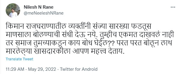 निलेश राणेंनी संजय राऊतांच्या पत्रकार परिषदेनंतर लगेच ट्विटरवरुन निशाणा साधला. या ट्विटमध्ये संजय राऊत यांचा एकेरी उल्लेख करतानाच छत्रपतींच्या घराण्याला एकमत दाखवण्याचा सल्ला निलेश राणेंनी दिलाय. “किमान राजघराण्यातील व्यक्तींनी संजय राऊतांसारख्या फडतूस माणसाला बोलण्याची संधी देऊ नये. तुम्हीच एकमत दाखवलं नाही तर समाज तुमच्याकडून काय बोध घेईल? परत परत बोलून लाथ मारलेल्या खासदारकीला आपण महत्त्व देताय,” असं निलेश राणेंनी म्हटलंय.