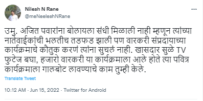 “उपमुख्यमंत्री अजित पवारांना बोलायला संधी मिळाली नाही म्हणून त्यांच्या नातेवाईकांची भलतीच तडफड झाली पण वारकरी संप्रदायाच्या कार्यक्रमाचे कौतुक करणं त्यांना सुचलं नाही,” असा टोला निशेल राणेंनी ट्विटरवरुन लागवलाय. पुढे बोलताना त्यांनी, “खासदार सुळे टीव्हीवरील फुटेज बघा. हजारो वारकरी या कार्यक्रमाला आले होते. त्या पवित्र कार्यक्रमाला गालबोट लावण्याचे काम तुम्ही केले,” असंही म्हटलंय.
