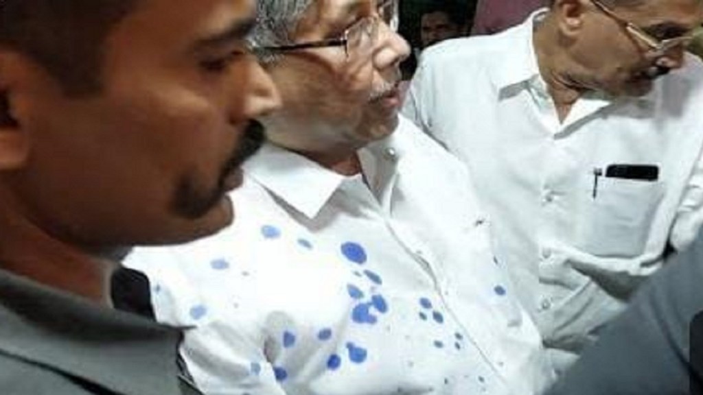 या पार्श्वभूमीवर शासकीय विश्रामगृहात नवीन पालकमंत्री चंद्रकांत पाटील आले असता त्यांच्याभोवती स्वतः पोलीस आयुक्त डॉ. राजेंद्र माने यांच्या समक्ष पोलिसांचा बंदोबस्त असताना भीम आर्मी संघटनेचे शहराध्यक्ष अजय ऊर्फ रावण संतोष मैंदर्गीकर (वय २६) यांनी पोलिसांचे कडे तोडून पालकमंत्र्यांच्या अंगावर शाईफेक करून काळा झेंडा दाखविला होता. शासकीय नोकऱ्यांचे कंत्राटीकरण रद्द करण्याची मागणी करीत मैंदर्गीकर यांनी हे कृत्य केले होते. त्यांच्याविरुद्ध पोलिसांनी सरकारी कामात अडथळा आणल्याच्या आरोपाखाली दखलपात्र गुन्हा दाखल करून त्यांना अटक केली होती. ते २६ दिवस अटकेत होते.