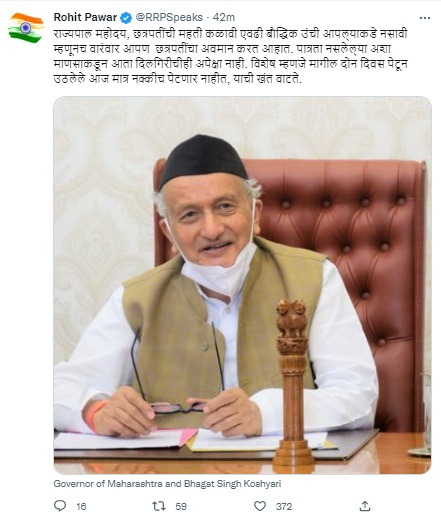 कोश्यारी यांच्या या विधानानंतर रोहित पवार यांनी ट्वीटरवरुन त्यांचा फोटो पोस्ट करत नाराजी व्यक्त केली आहे. “राज्यपाल महोदय, छत्रपतींची महती कळावी एवढी बौद्धिक उंची आपल्याकडे नसावी म्हणूनच वारंवार आपण छत्रपतींचा अवमान करत आहात. पात्रता नसलेल्या अशा माणसाकडून आता दिलगिरीचीही अपेक्षा नाही,” असा टोला रोहित पवारांनी लगावला आहे. तर भाजपा आणि शिंदे गटावर अप्रत्यक्षपणे निशाणा साधताना, “विशेष म्हणजे मागील दोन दिवस पेटून उठलेले आज मात्र नक्कीच पेटणार नाहीत, याची खंत वाटते,” असंही रोहित पवार म्हणालेत.