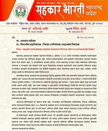 “राज्यात सध्या नवीन मंत्रीमंडळ अस्तित्वात नसताना आणि राज्याला नवा सहकार मंत्री देखील मिळालेला नसताना प्रशासनाने अशा पद्धतीचे परिपत्रक काढून राज्यातील सहकारी पतसंस्थांमध्ये एक भीतीचे वातावरण तयार करण्याचा प्रयत्न केला आहे. सहकार भारती म्हणून आम्ही या परिपत्रकाचा जाहीर निषेध करतो”, असं देखील या पत्रकात नमूद केलं आहे.