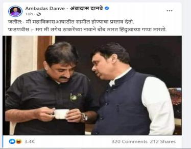 त्यानंतर अंबादास दानवे यांनी राज्याचे माजी मुख्यमंत्री आणि विरोधी पक्षनेते देवेंद्र फडणवीस आणि खासदार इम्तियाज जलील यांचा एक फोटो फेसबुकवर पोस्ट केला आहे. यामध्ये “जलील फडणवीसांना म्हणत आहे की, मी महाविकास आघाडीत सामील होण्याचा प्रस्ताव देतो. त्यावर फडणवीस म्हणत आहेत की, मग मी लगेच ठाकरेंच्या नावाने बोंब मारत हिंदुत्वाच्या गप्पा मारतो,” असे बोलत असल्याचे म्हटले आहे.