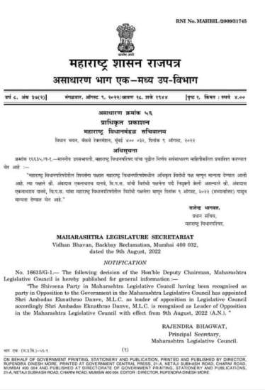 महाराष्ट्र विधीमंडळाच्या सचिवालयाकडून अधिसूचना प्रसिद्ध करत यासंबंधी माहिती देण्यात आली आहे. विधान परिषदेचे प्रधान सचिव राजेंद्र भागवत यांनी दिलेल्या माहितीनुसार, महाराष्ट्र विधान परिषदेतील शिवेसना पक्षास अधिकृत विरोधी पक्ष म्हणून मान्यता देण्यात आली आहे. तसंच शिवसेनेचे औरंगाबादमधील आमदार अंबादास दानवे यांची विरोधी पक्षनेतेपदी नियुक्ती करण्यात आली आहे.