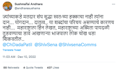 याच वादामध्ये आता सुषमा अंधारेंनीही उडी घेतली आहे. “ज्यांच्याकडे मतदारसंघ सुद्धा स्वतःच्या हक्काचा नाही त्यांना दान, योगदान, दातृत्व, या शब्दांचा परिचय असण्याचे कारणच नाही. महाराष्ट्राला हिन लेखत, महाराष्ट्राच्या अस्मिता पायदळी तुडवण्याचा डाव आखणाऱ्या भाजपाला लोक चोख धडा शिकवतील,” असं ट्वीट सुषमा अंधारेंच्या ट्विटर अकाऊंटवरुन करण्यात आलं आहे.
