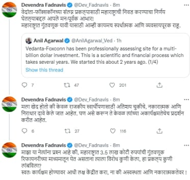 याच ट्वीट थ्रेडमध्ये १ लाख ६६ हजार कोटी रुपयांची गुंतवणूक असणाऱ्या मूळ प्रकल्प महाराष्ट्राऐवजी गुजरातला गेल्याबद्दल होत असणाऱ्या आरोप प्रत्यारोपांवर भाष्य करताना फडणवीस यांनी विरोधकांना लक्ष्य केलं आहे. “मला खेद होतो की केवळ राजकीय स्वार्थीपणासाठी अतिशय चुकीचे, नकारात्मक आणि निराधार दावे केले जात आहेत. पण असे करून ते केवळ त्यांच्या अकार्यक्षमतेचेच प्रदर्शन करीत आहेत,” असं फडणवीस यांनी थेट कोणाचाही उल्लेख न करता म्हटलं आहे.