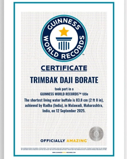 जानेवारी २०२५ रोजी ‘राधा’ची इंडिया बुक ऑफ रेकॉर्ड्समध्येही नोंद झाली. परभणी येथील कृषी प्रदर्शनानंतर अनिकेत याने ‘राधा’च्या गिनीज वर्ल्ड रेकॉर्डसाठी प्रयत्न सुरू केले. यात पशुधन विकास अधिकारी डॉ. शरद थोरात यांचे मोलाचे मार्गदर्शन लाभले. त्यांनी म्हशीची पाहणी करून अहवाल सप्टेंबरमध्ये पाठवला.