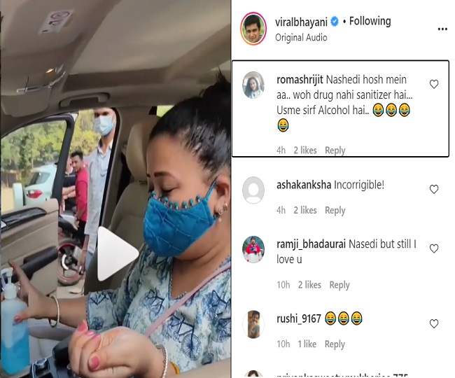 सेलिब्रिटी फोटोग्राफर विरल भयानीने त्याच्या इन्स्टाग्राम अकाऊंटवर एक व्हिडीओ शेअर केला आहे. या व्हिडीओमध्ये भारती गाडीमध्ये बसली आहे. तिने मास्क घातले आहे. दरम्यान ती हातावर सॅनिटायझर घेते आणि हाताला चोळते. सॅनिटायझर कसे वापरायचे हे भारती व्हिडीओमध्ये सांगताना दिसत आहे. तिचा हा व्हिडीओ सोशल मीडियावर तुफान व्हायरल झाला आहे.