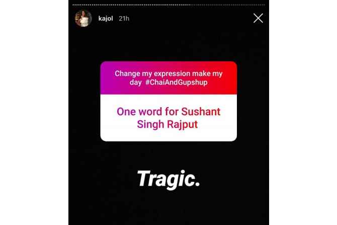 अभिनेत्री काजोलने इन्स्टाग्रामच्या माध्यमातून चाहत्यांशी गप्पा मारल्या. त्यांच्या प्रश्नांची तिने उत्तरं दिली. त्यातच एका चाहत्याने तिला सुशांतविषयी एक शब्द बोलण्यास सांगितलं. यावर उत्तर देताना काजोल म्हणाली, ‘दु:खद’. या प्रश्नोत्तरामध्ये काजोलने नवोदित कलाकारांसाठीही महत्त्वपूर्ण सल्ला दिला. ‘जसे आहात तसे राहा. कोणाची कॉपी करण्याचा प्रयत्न करू नका’, असा सल्ला तिने दिला.