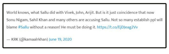 गेल्या काही काळात कमाल सातत्याने सलमानवर टीका करत आहे. “संपूर्ण जगाला माहिती आहे सलमानने विवेक, जॉन आणि अर्जित यांच्यासोबत काय केलं. आता सोनू निगम, साहिल खान आणि इतर कलाकार त्याच्यावर आरोप करत आहेत. हा निव्वळ योगायोग नाही. सलमानने नक्कीच यांच्यासोबत काही तरी केलं आहे. उगाचच कोणी त्याच्यावर आरोप करत नाही.” यापूर्वी त्याने अशा आशयाचे ट्विट करुन सलमानवर निशाणा साधला होता.