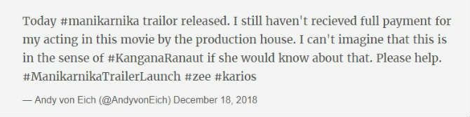 ‘मणिकर्णिका : द क्वीन ऑफ झाँशी’ या चित्रपटाचा ट्रेलर नुकताच प्रदर्शित झाला. गेल्या कित्येक महिन्यांपासून या चित्रपटाच्या निर्मितीत काहीना काही अडचणी येत आहेत. काही दिवसांपासून चित्रपटासाठी काम करणाऱ्या कर्मचाऱ्यांनी पैसे न मिळाल्यानं नाराजी व्यक्त केली होती. हा वाद ताजा असताना या चित्रपटात काम करणारा अभिनेता अँडी वॉन इचनंही संपूर्ण मानधन न मिळाल्यानं आपली नाराजी ट्विटरवर व्यक्त केली आहे.