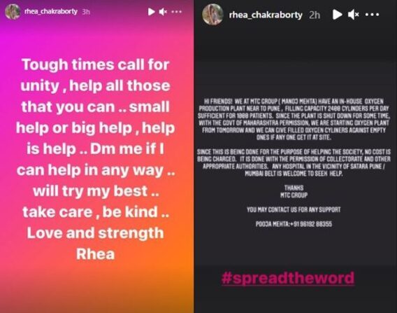 सुशांत सिंह आत्महत्या प्रकरणात कारवाई झाल्यानंतर अभिनेत्री रिया चक्रवर्ती बॉलिवूडपासून दूर गेली आहे. सोशल मीडियावर देखील रिया फारशी सक्रिय नसते. मात्र नुकतीच रिया चक्रवर्तीने तिच्या इन्स्टा स्टोरीवर एक पोस्ट शेअर करत मदतीचा हात पुढे केला आहे. सध्याकरोनाच्या काळात अनेक सेलिब्रिटी गरजुंच्या मदतीसाठी पुढाकार घेत आहेत. कुणी रुग्णांना बेड मिळावा यासाठी प्रयत्न करतंय तर कुणी ऑक्सिनजन पुरवठ्यासाठी. यातच आता रियादेखील मदतीसाठी पुढे आली आहे.