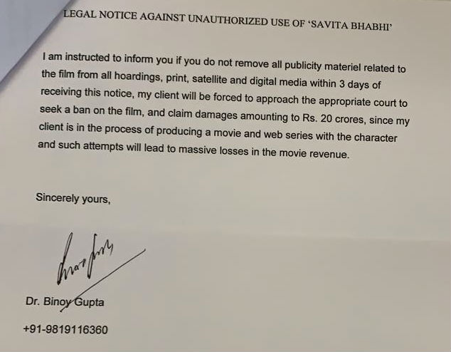 आलोक राजवाडे दिग्दर्शित ‘अश्लील उद्योग मित्र मंडळ’ या चित्रपटामध्ये अभिनेत्री सई ताम्हणकर मुख्य भूमिका वठवत असून ती सविता भाभी ही व्यक्तीरेखा साकारत आहे. त्यामुळे या चित्रपटाची प्रसिद्धी करण्यासाठी चित्रपटाच्या टीमने पुण्यात ‘सविता भाभी… तू इथंच थांब!!’ असे होर्डिंग्ज लावले होते. या होर्डिग्सची चांगली चर्चाही रंगली होती. मात्र, याच दरम्यान निलेश गुप्ता यांनी कायदेशीर नोटीस पाठविली आहे.