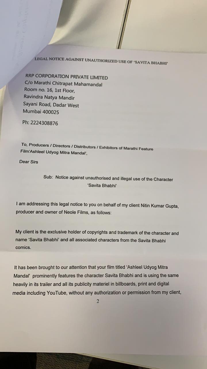 गेल्या काही दिवसापूर्वी पुण्यात ‘सविता भाभी’ची चांगलीच चर्चा रंगली होती. ‘अश्लील उद्योग मित्र मंडळ’ या चित्रपटाच्या टीमने हटके पद्धत वापरत चित्रपटाचं प्रमोशन केलं होतं. मात्र आता या चित्रपटातील सविता भाभी या कॉमिक कॅरेक्टरवरुन वाद निर्माण झाला आहे. निलेश गुप्ता यांनी हे पात्र कॉमिक कॉपीराइट असल्याचं सांगत चित्रपटाच्या टीमला कायदेशीर नोटीस पाठविली आहे.