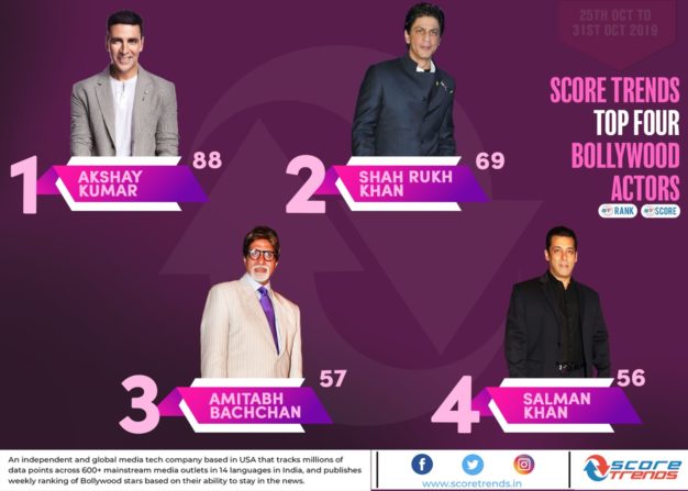 рджрд░рдореНрдпрд╛рди, рднреВрдорд┐рдкреНрд░рдорд╛рдгреЗрдЪ рд▓реЛрдХрдкреНрд░рд┐рдп рдЕрднрд┐рдиреЗрддреНрдпрд╛рдВрдЪреНрдпрд╛ рдпрд╛рджреАрдордзреНрдпреЗ рдЕрдХреНрд╖рдп рдХреБрдорд╛рд░рдиреЗ рдкреНрд░рдердо рд╕реНрдерд╛рди рдкрдЯрдХрд╛рд╡рд▓рдВ рдЖрд╣реЗ. ‘рдорд┐рд╢рди рдордВрдЧрд▓’ рдЖрдгрд┐ ‘рд╣рд╛рдЙрд╕рдлреБрд▓-рек’рдирдВрддрд░ рддреНрдпрд╛рдЪреНрдпрд╛ рд▓реЛрдХрдкреНрд░рд┐рдпрддреЗрдордзреНрдпреЗ рдХрдорд╛рд▓реАрдЪреА рд╡рд╛рдв рдЭрд╛рд▓реА. реорео рдЧреБрдгрд╛рдВрд╕рд╣ рддреЛ рдкреНрд░рдердо рд╕реНрдерд╛рдирд╡рд░ рдЖрд╣реЗ. рдпрд╛рдордзреНрдпреЗ рддреНрдпрд╛рдиреЗ рд╢рд╛рд╣рд░реБрдЦрд╡рд░рд╣реА рдорд╛рдд рдХреЗрд▓реА рдЖрд╣реЗ. рд╢рд╛рд╣рд░реБрдЦрд▓рд╛ ремреп рдЧреБрдг рдорд┐рд│рд╛рд▓реНрдпрд╛рдореБрд│реЗ рддреЛ рджреБрд╕рд▒реНрдпрд╛ рд╕реНрдерд╛рдирд╛рд╡рд░ рдЖрд╣реЗ. рддрд░ рдЕрдиреБрдХреНрд░рдореЗ рддрд┐рд╕рд▒реНрдпрд╛ рдЖрдгрд┐ рдЪреМрдереНрдпрд╛ рд╕реНрдерд╛рдирд╛рд╡рд░ рдЕрдорд┐рддрд╛рдн рдмрдЪреНрдЪрди, рд╕рд▓рдорд╛рди рдЦрд╛рди рдЖрд╣реЗрдд.