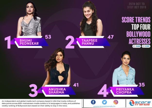 рдЕрдореЗрд░рд┐рдХреЗрдЪреНрдпрд╛ ‘рд╕реНрдХреЛрд░ рдЯреНрд░реЗрдВрдбреНрд╕ рдЗрдВрдбрд┐рдпрд╛’рдЪреНрдпрд╛ рдЕрд╣рд╡рд╛рд▓рд╛рдиреБрд╕рд╛рд░, тАШрд╕рд╛рдВрдб рдХреА рдЖрдВрдЦтАЩ рдЪрд┐рддреНрд░рдкрдЯрд╛рддрд▓реНрдпрд╛ рдЙрддреНрддрдо рдЕрднрд┐рдирдпрд╛рдореБрд│реЗ рднреВрдорд┐ рдкреЗрдбрдгреЗрдХрд░ рд▓реЛрдХрдкреНрд░рд┐рдп рдЕрднрд┐рдиреЗрддреНрд░реАрдВрдордзреНрдпреЗ рдкреНрд░рдердо рд╕реНрдерд╛рдирд╛рд╡рд░ рдЖрд╣реЗ. рддрд┐рдиреЗ релрей рдЧреБрдгрд╛рдВрд╕рд╣ рдкрд╣рд┐рд▓рд╛ рдХреНрд░рдорд╛рдВрдХ рдкрдЯрдХрд╛рд╡рд▓рд╛ рдЖрд╣реЗ. рддрд░ рекрен рдЧреБрдгрд╛рдВрд╕рд╣ рддрд╛рдкрд╕реА рдкрдиреНрдиреВ рджреБрд╕рд▒реНрдпрд╛ рд╕реНрдерд╛рдирд╛рд╡рд░ рдЖрд╣реЗ. рддреНрдпрд╛рдЪрдкреНрд░рдорд╛рдгреЗ рдпрд╛ рдпрд╛рджреАрдордзреНрдпреЗ рдЕрдиреБрд╖реНрдХрд╛ рд╢рд░реНрдорд╛ рддрд┐рд╕-рдпрд╛ рд╕реНрдерд╛рдирд╛рд╡рд░ рддрд░ рдкреНрд░рд┐рдпрдВрдХрд╛ рдЪреЛрдкреНрд░рд╛ рдЪреМрдереНрдпрд╛ рд╕реНрдерд╛рдирд╛рд╡рд░ рдЖрд╣реЗ.