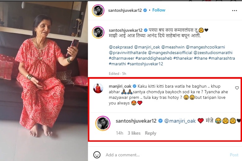 संतोष जुवेकरने या व्हिडीओला हटके कॅप्शन दिले आहे. “पश्या बघ काय कमावलंयस तू. माझी आई आज तिच्या आनंद दिघे साहेबांना बघून आली”, असे त्याने कॅप्शन देताना म्हटले आहे. तसेच त्याने हा व्हिडीओ प्रसाद ओक, मंजिरी ओक, प्रवीण तरडे यांसह संपूर्ण चित्रपटाच्या टीमला टॅग केला आहे.