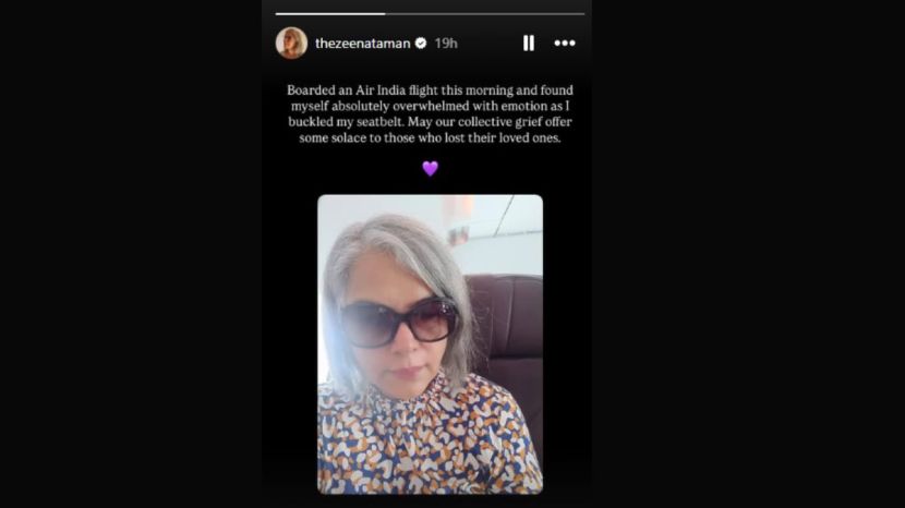 झीनत अमान यांनी त्यांच्या इन्स्टाग्रामवर एक पोस्ट शेअर केली आहे. या पोस्टमध्ये झीनत यांनी स्वतःचा एक फोटो शेअर केला आहे. याबरोबरच त्यांनी एक कॅप्शनदेखील लिहिले आहे. झीनत यांनी लिहिले की, आज सकाळी एअर इंडियाच्या विमानात बसले आणि सीट बेल्ट लावताच मी भावनेने भारावून गेले. ज्यांनी आपल्या प्रियजणांना गमावले त्यांच्याबरोबर आपले सांत्वन असेल.