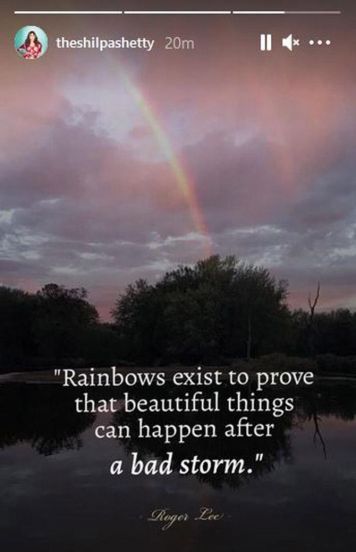 शिल्पाने तिच्या इन्स्टाग्राम अकाऊंटवर एक सकारात्मक स्टोरी शेअर केली आहे. या पोस्टमध्ये शिल्पाने इंद्रधनुष्य असलेला फोटो पोस्ट केला आहे. या फोटोवर ‘एका मोठ्या वादळानंतरच सुंदर इंद्रधनुष्य दिसते. हे इंद्रधनुष्य वादळानंतरदेखील अनेक चांगल्या गोष्टी होऊ शकतात हे सांगते’ या आशयाची पोस्ट शिल्पाने केली आहे.