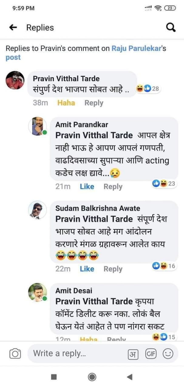 सोशल मीडियावर प्रवीण तरडे यांना ट्रोल केल्यामुळे त्यांनी काही वेळातच ही कमेंट डिलीट केली. पण त्यांच्या या कमेंटचे स्क्रीन शॉट मात्र मोठ्या प्रमाणात व्हायरल झाले. तसेच त्यांच्या फेसबुक पोस्टवर अनेक नेटकरी नकारार्थी कमेंट करत असल्याचे दिसत आहे.